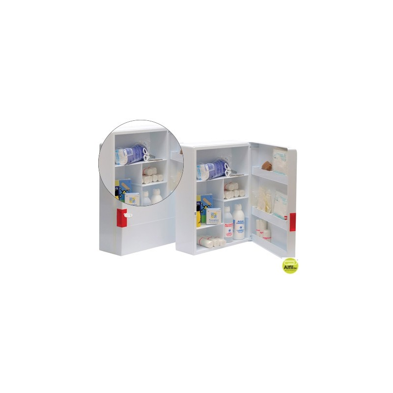 Fabricado con material pl˜stico de alto impacto. Provisto de separadores interiores y bandeja en la puerta. Con cerradura y llave. Incluye el material previsto para los primeros auxilios. Contenido del botiquðn y del repuesto: 5 paquetes de gasas, 15 rollos de vendas: 5 de 10 cm de ancho, 5 de 7cm y 5 de 5 cm x 5 metros de longitud; 1 goma para extracciones, 1 paquete de algod«n, 1 tijeras, 1 par de guantes, 1 pinzas, 1 rollo de esparadrapo, 2 paquetes de tiritas, 1 bote de alcohol, 1 bote de agua oxigenada y 1bote de povidona yodada. Medidas: 460 x 340 x 150 mm.